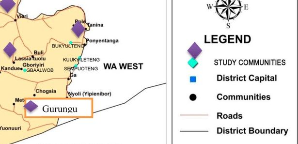 Wa West District is one of the eleven administrative districts of the Upper West Region of Ghana. It is located in the North Western part of the region and stretches from longitudes 40°N to 245° and from latitudes 9″W to 32°W, covering an area of approximately 5,899.3 square kilometers. To the South, North-West and East, it has a common boundary with the Northern Region, Nadowli District and Wa Municipal respectively, and to the West with Burkina Faso.